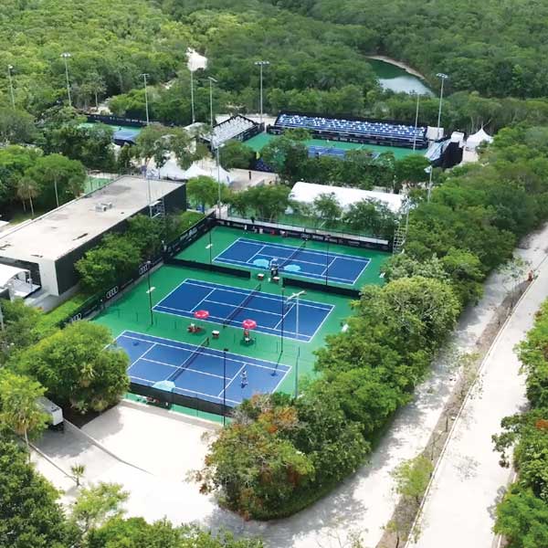 Canchas profesionales de tenis y pádel dentro de Cancún Country Club, rodeadas de áreas verdes.