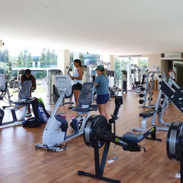 Gimnasio con vista al lago dentro de Casa Club, ideal para entrenamiento en un entorno natural y exclusivo.